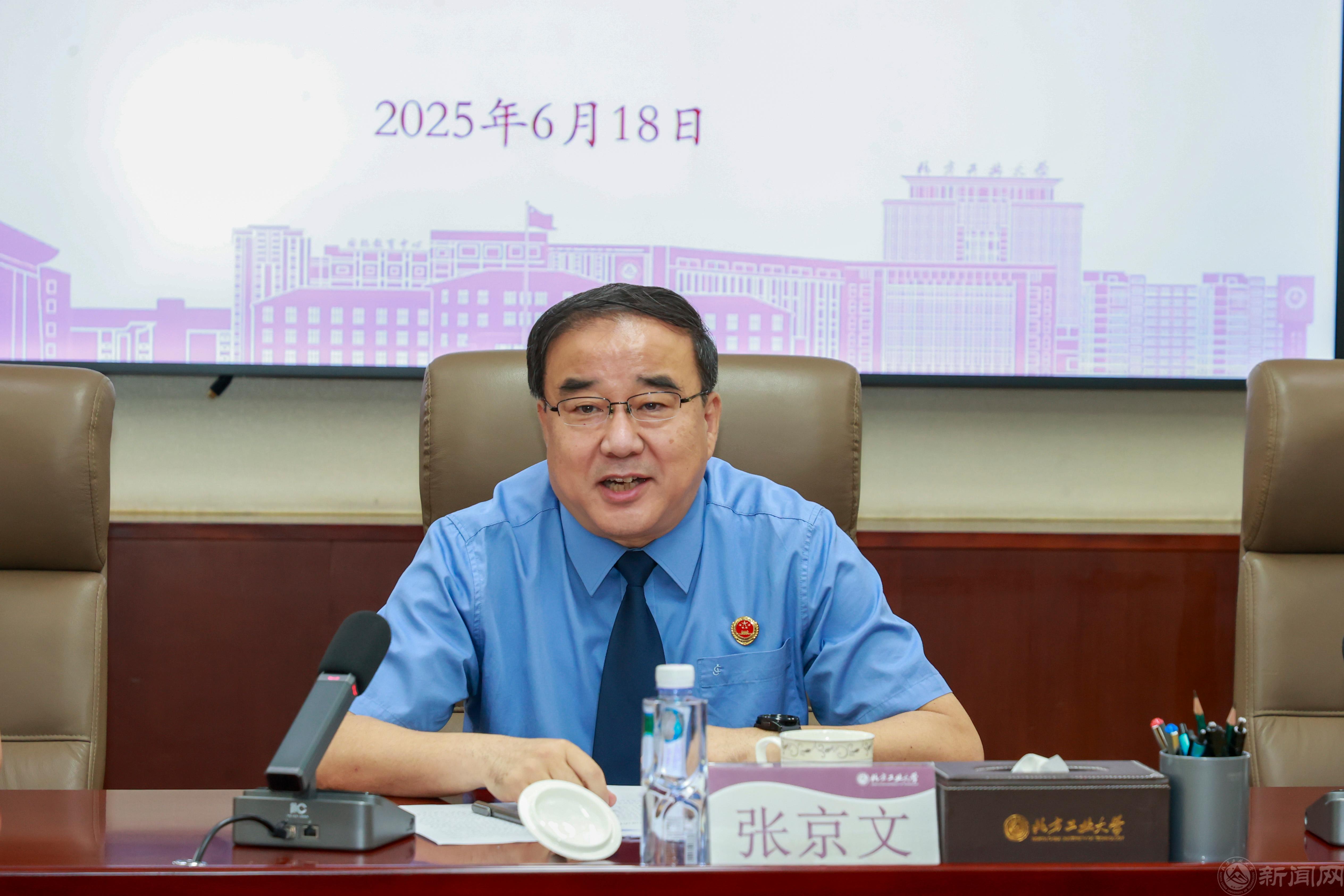 張立峰熱情歡迎石景山區人民檢察院檢察長張京文一行來訪。他介紹了學校歷史沿革和“四新”建設進展。他表示,北方工業大學地處石景山區,堅持“扎根京西,興工報國”,正朝著建設“特色鮮明、優勢突出的高水平工科大學”堅定邁進。作為石景山區檢察院多年的“睦鄰”和“好友”伙伴,希望以此次活動為契機,推進檢校合作深度融合,共同發展,攜手開啟深化檢校共建合作新篇章,為服務區域高端綠色崛起提供強有力保障,共同打造具有首都特色的法治人才培養中心,為全面依法治區、依法治市乃至依法治國貢獻力量。