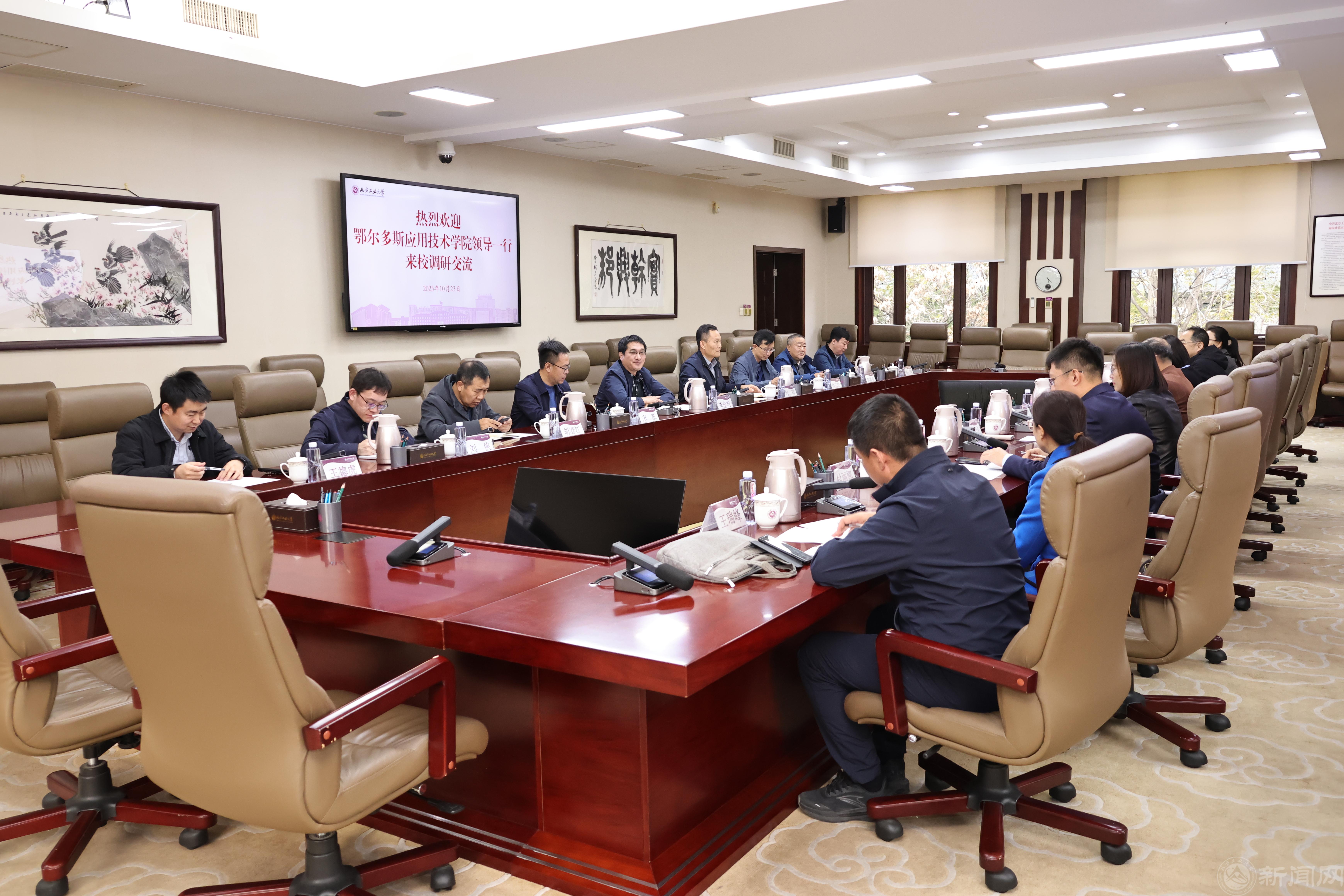 鄂爾多斯應用技術學院黨政辦公室、組織部、科學技術處、資產管理處、教學質量監控中心、管理學院,以及我校學校辦公室、組織部、教務處、科學技術研究院(科技成果轉化中心)、資產與實驗室管理處、校友工作辦公室、經濟管理學院等負責人參加了交流。