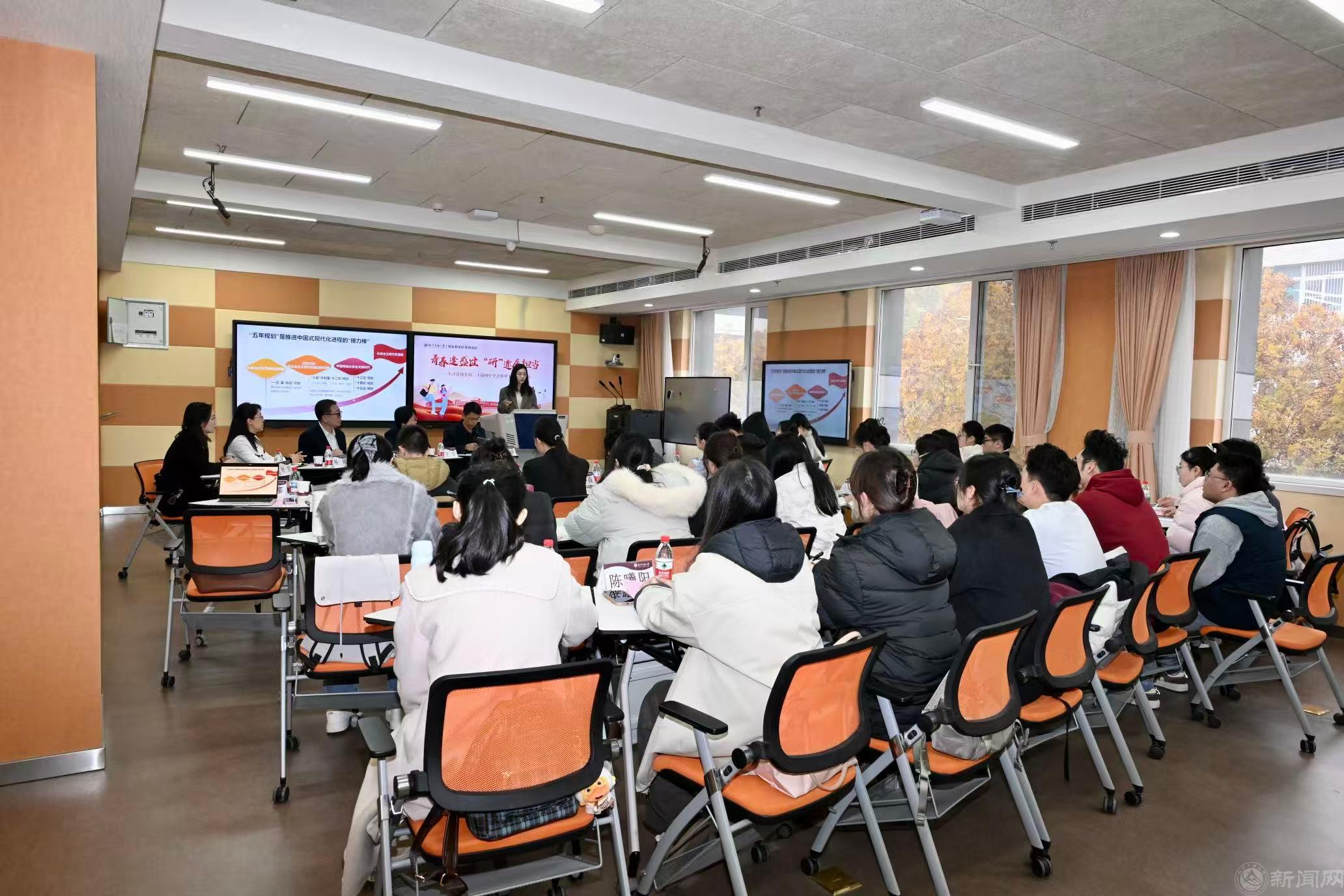 團日活動的“理論領航”環節,馬克思主義學院思政課教師鄭娜娜做黨的二十屆四中全會精神學習主題分享,引導同學們深刻把握全會核心要義,從“五年規劃”中讀懂中國之治的“密鑰”,引發同學們從“知”到“行”的思考。