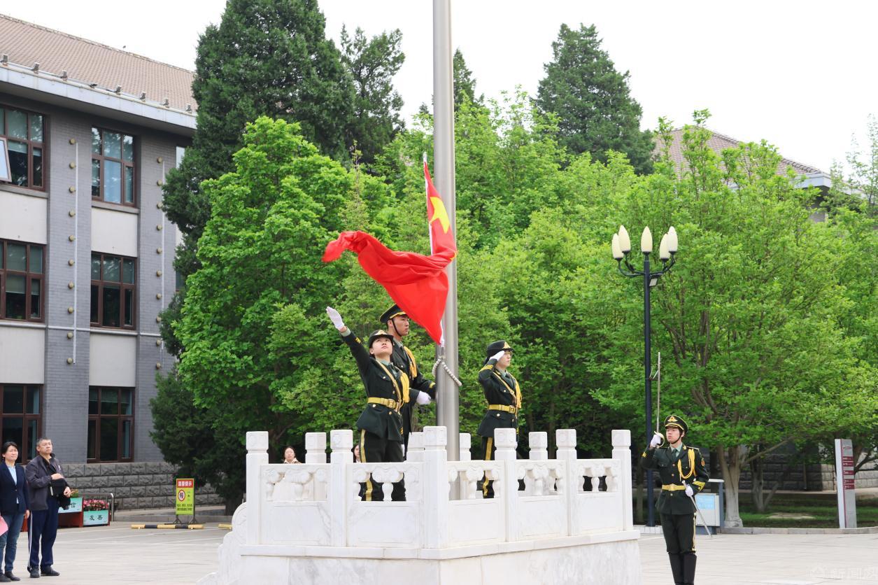 國旗班隊員邁著鏗鏘有力的步伐護送五星紅旗入場。在雄壯的《義勇軍進行曲》中,鮮艷的國旗冉冉升起,全體師生肅立注目,莊嚴的儀式激蕩著每個人的愛國情懷。