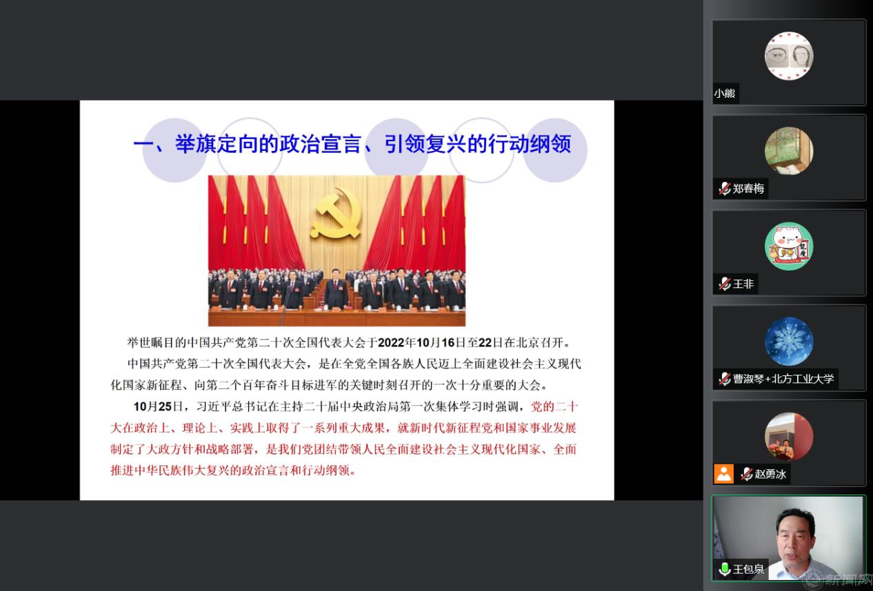 11月18日下午,離退休黨委理論學(xué)習(xí)中心組召開(kāi)線上學(xué)習(xí)會(huì),專題學(xué)習(xí)黨的二十大精神。離退休黨委委員王包泉作專題宣講,黨委委員、黨支部書記、副書記、支部委員、全體工作人員等近30人參加了學(xué)習(xí),學(xué)習(xí)會(huì)由離退休黨委書記趙永兵主持。